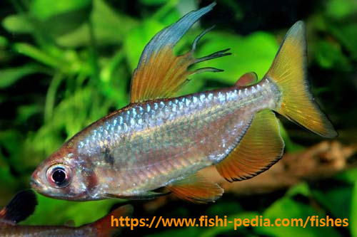 위스테리아 콩고 테트라라는 이름으로도 유통됩니다. 어린 개체는 연한 적색 채색을 띠고 있지만 적절한 환경에서 성숙하면 메탈릭 블루를 띤 비늘과 그 아래에서 스며 나오는 듯한 보라색채색을 가진 멋진 모습이 됩니다.